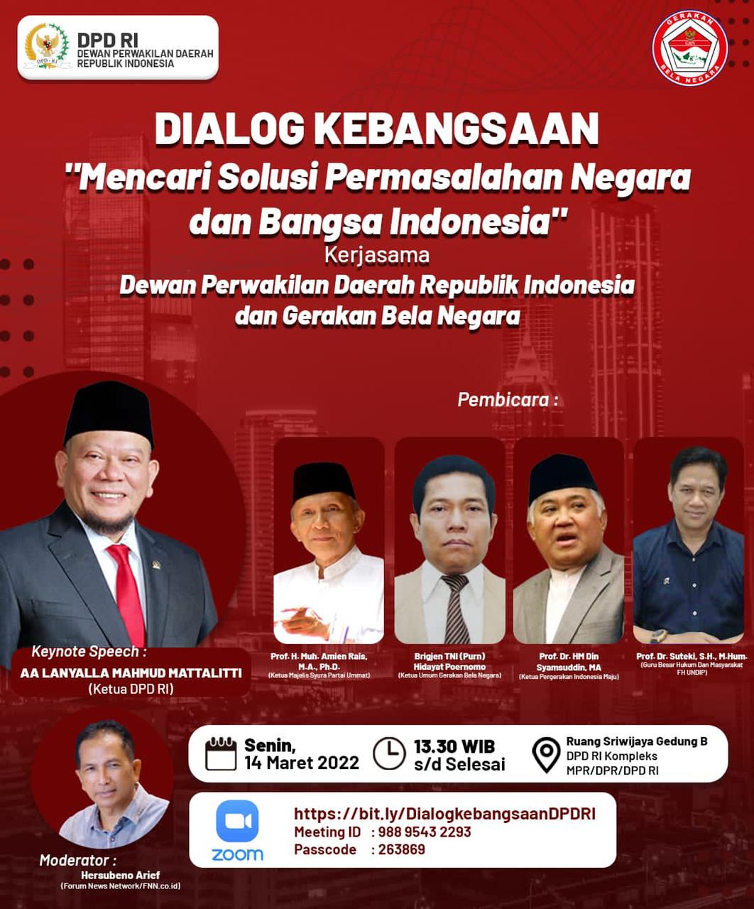 Dalam kegiatan yang merupakan kerjasama DPD RI dengan Gerakan Bela Negara, Ketua DPD RI, AA LaNyalla Mahmud Mattalitti, akan menyampaikan Keynote Speech, sekaligus membuka acara.
