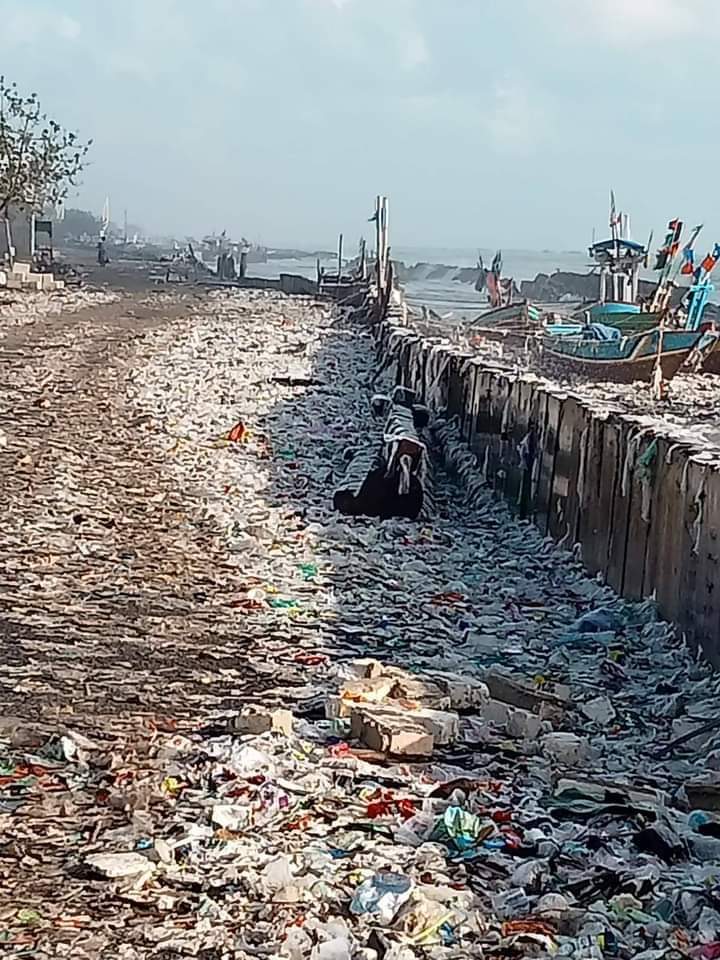 Sarang, IPers - Kejadian gelombang tinggi di perairan laut pantura khususnya di kecamatan sarang Rembang, pada hari Senin 23 Mei 2022. mengakibatkan beberapa penahan jalan pesisir ambrol dan kembalinya sampah sampah yang di buang ke laut menumpuk didaratan.