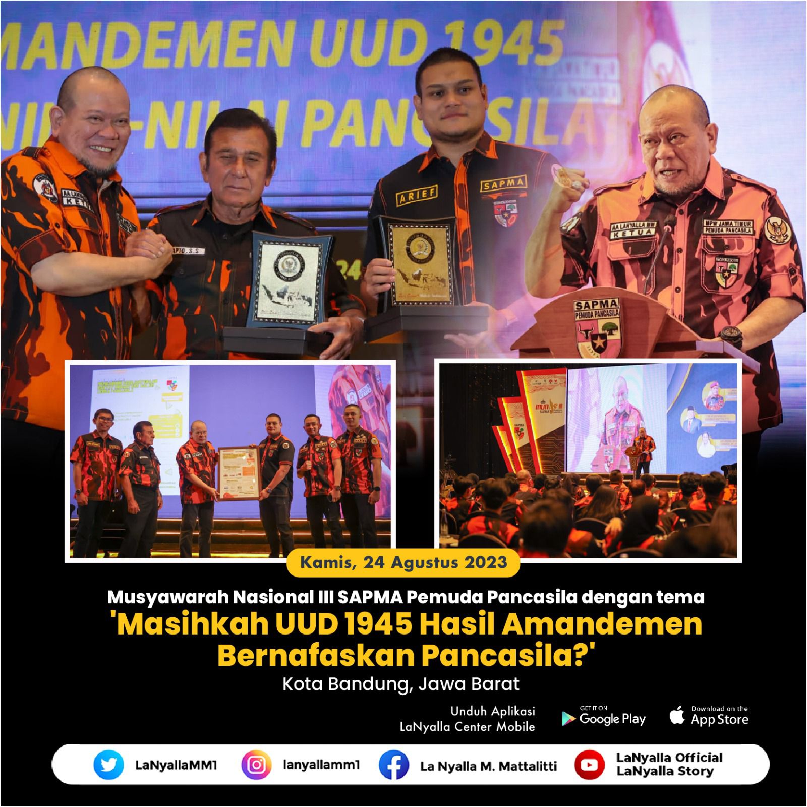 Hal itu dikatakan LaNyalla dalam pidatonya pada acara Musyawarah Nasional III SAPMA Pemuda Pancasila dengan tema 'Masihkan UUD 1945 Hasil Amandemen Bernafaskan Pancasila?' di The Trans Luxury Hotel - Trans Grand Ballroom, Kota Bandung, Jawa Barat, Kamis (24/8/2023).