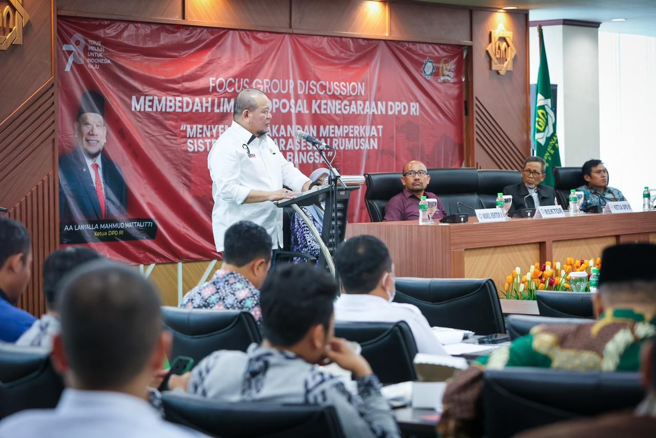 Hal itu terungkap pada acara Focus Group Discussion (FGD) Membedah Proposal Kenegaraan DPD RI dengan tema 'Menyempurnakan dan Memperkuat Sistem Bernegara Sesuai Rumusan Pendiri Bangsa' yang diselenggarakan di Meeting Room Tengku Ismail Ya’kub Tower, Universitas Islam Negeri Sunan Ampel Surabaya, Rabu (6/9/2023).