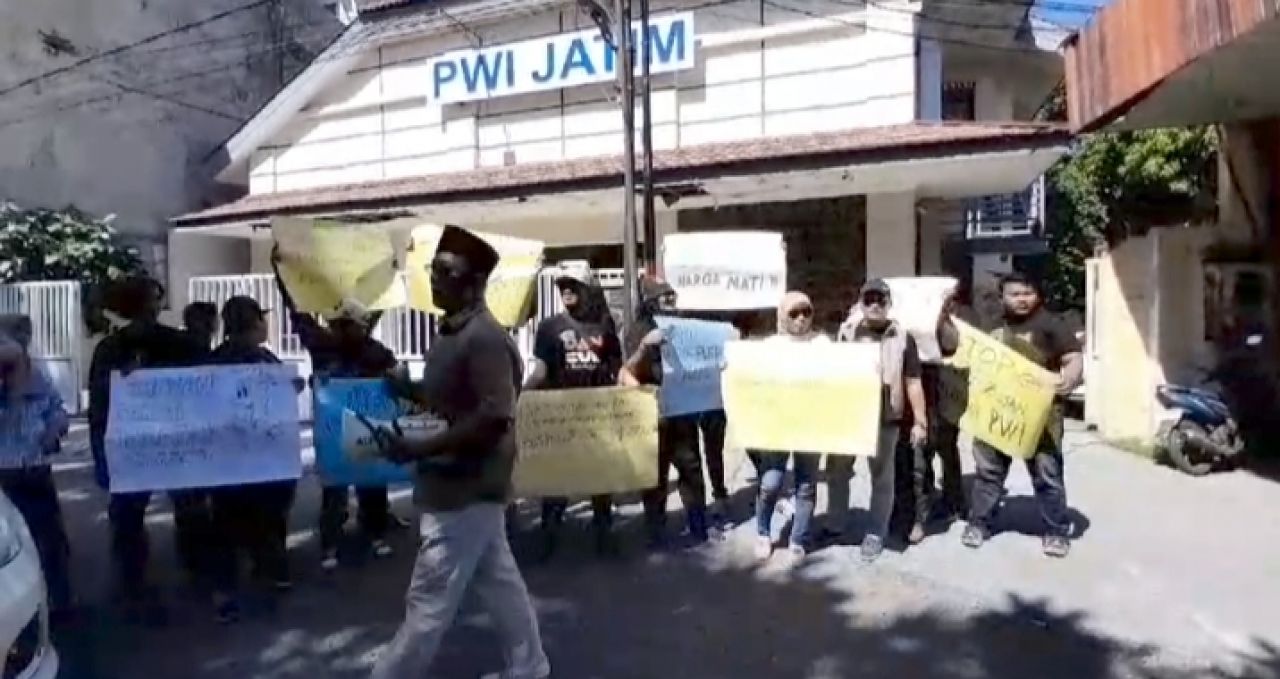 SURABAYA, IPERS - Puluhan pekerja pers dari berbagai media di Jawa Timur melakukan demontrasi di halaman depan Gedung PWI Jawa Timu di Jl Taman Apsari 15-17 Surabaya, Senin (22/07/2024) siang.