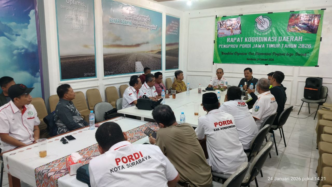 Rakorda tersebut dilaksanakan pada Sabtu, 24 Januari 2026, bertempat di Diponggo Culinari & Sport, Jalan Bintang Diponggo, Surabaya. Agenda utama rapat adalah pembahasan koordinasi program kerja organisasi Pordi di tingkat provinsi dan daerah guna memastikan keselarasan arah kebijakan serta efektivitas pelaksanaan kegiatan ke depan.